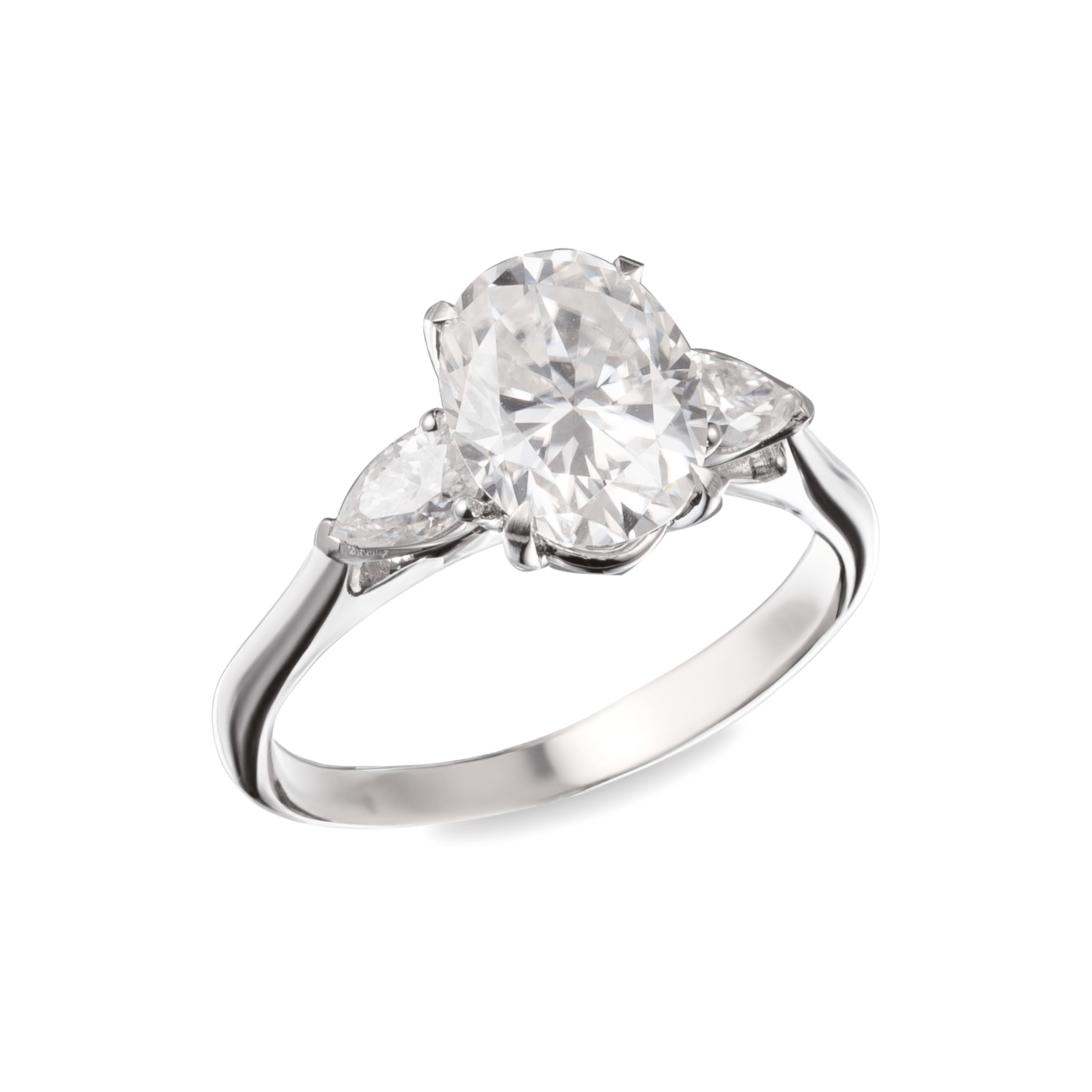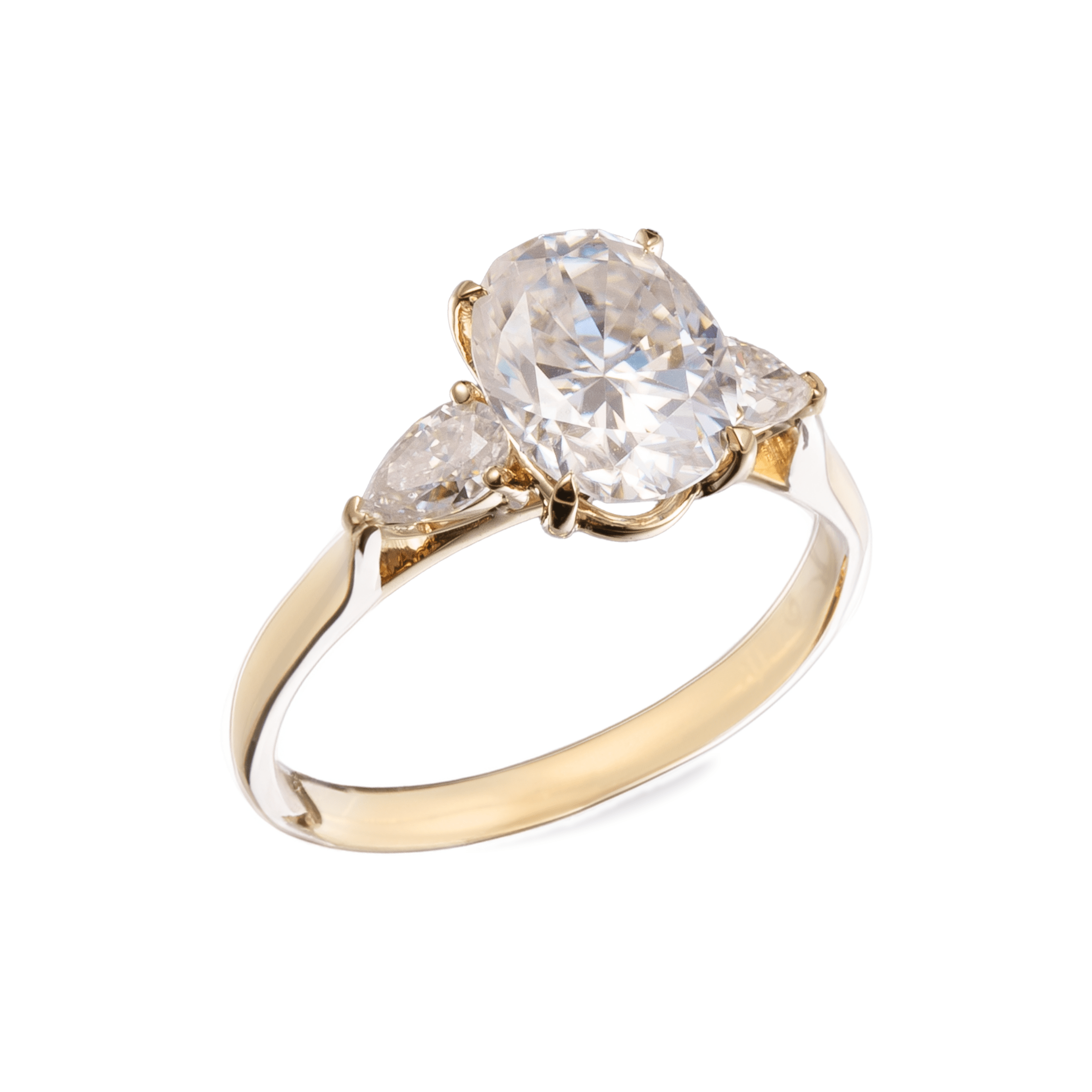 Este anillo de compromiso está disponible en oro blanco o amarillo 14K, con una zirconia central corte ovalado acompañada de dos piedras laterales corte pera que realzan su brillo y equilibrio.