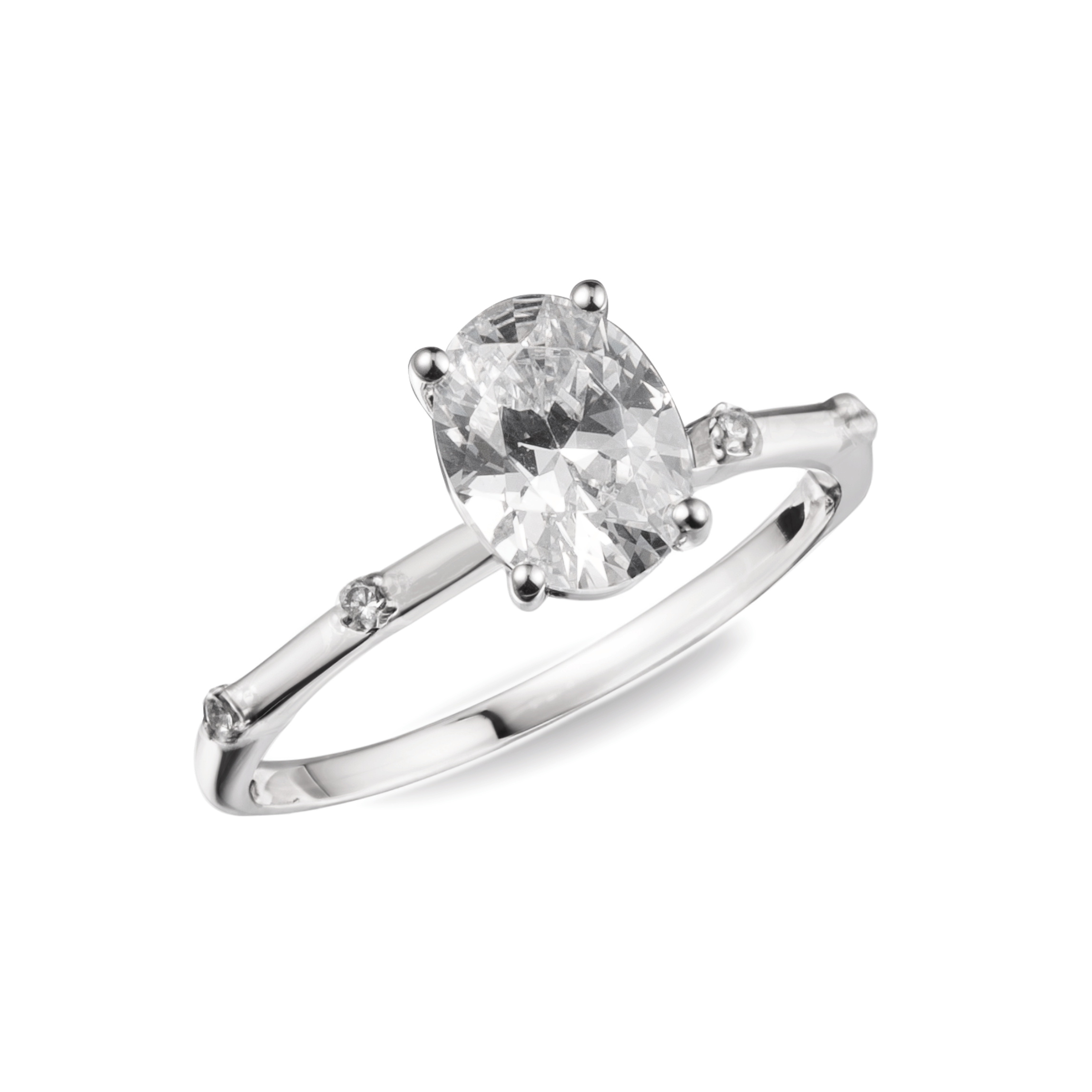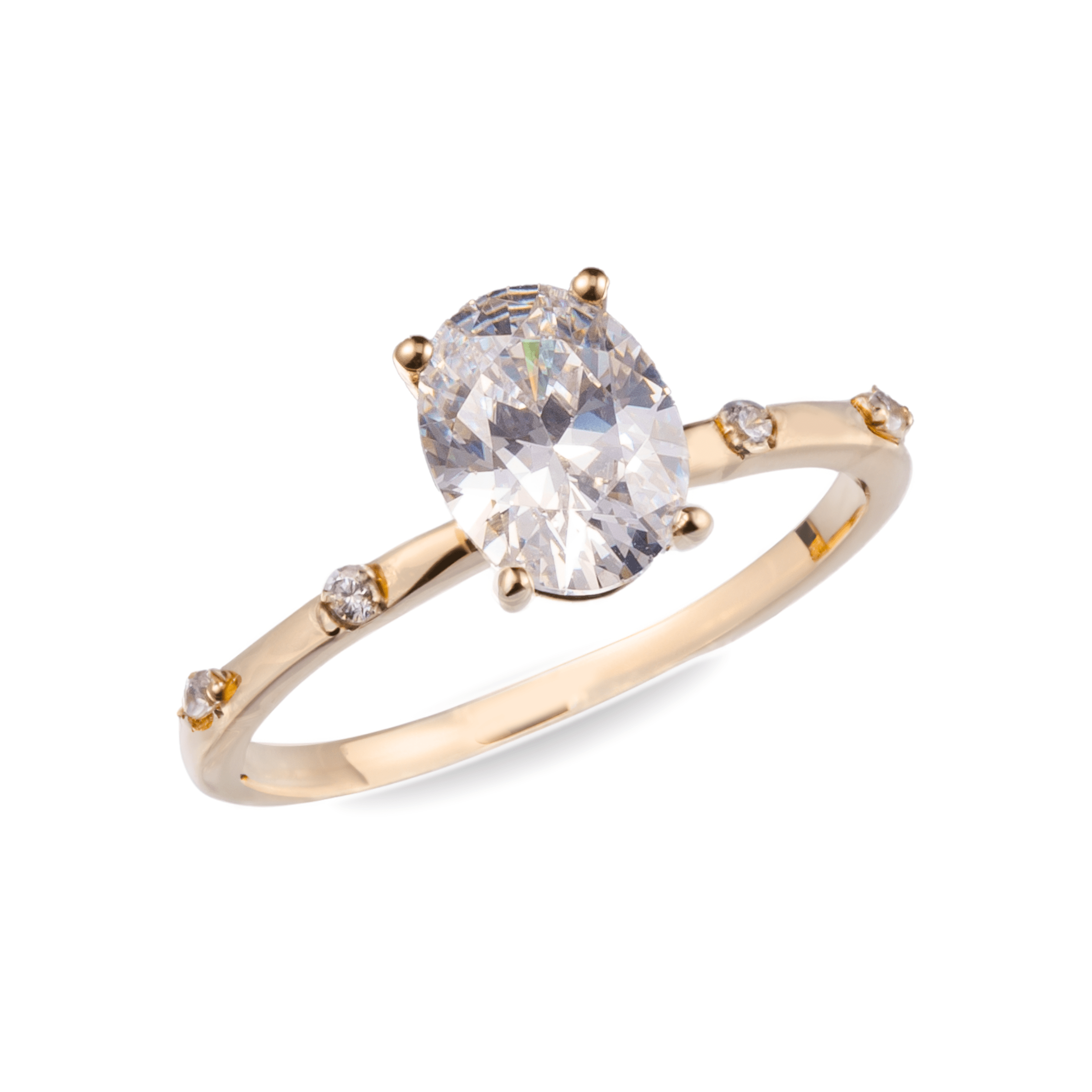 Un solitario pensado para quienes aman lo clásico con un toque moderno. La zirconia central en corte ovalado, sostenida por cuatro garras, se convierte en la protagonista absoluta. El aro pulido, adornado con pequeños acentos de zirconias, realza la belleza de la pieza sin restarle delicadeza. Ideal tanto como anillo de compromiso como para un regalo cargado de significado.